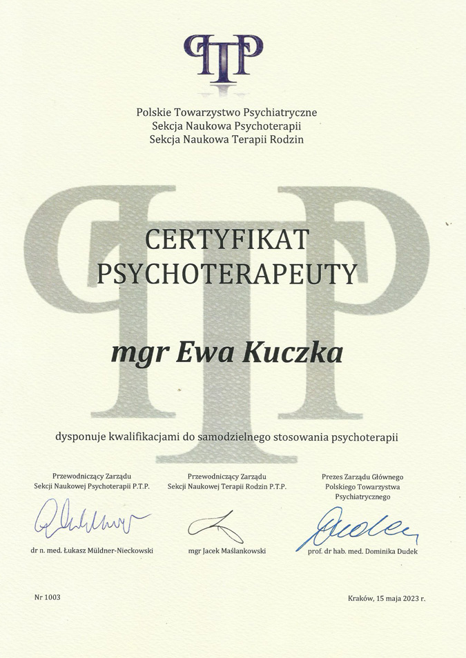 Trzy lata później ukończyłam całościowe, 4-letnie szkolenie do certyfikatu psychoterapeuty atestowane przez Sekcję Naukową Psychoterapii Polskiego Towarzystwa Psychiatrycznego i prowadzone przez Ośrodek Leczenia Nerwic i Zaburzeń Jedzenia „Dąbrówka” w Gliwicach oraz Polski Instytut Psychodramy w Krakowie. Zdobyłam tytuł asystenta Europejskiego Instytutu Psychodramy. W 2023 roku zdałam egzamin na certyfikat psychoterapeuty Polskiego Towarzystwa Psychiatrycznego.